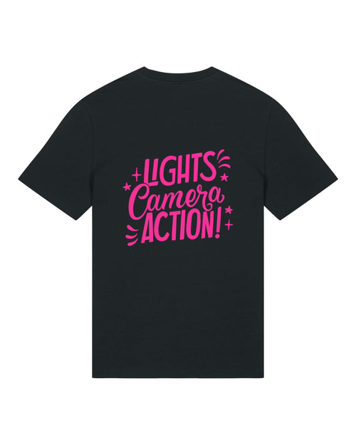 Voorzien van DJMA logo klein op linkerborst en op rug een design van Lights Camera Action.